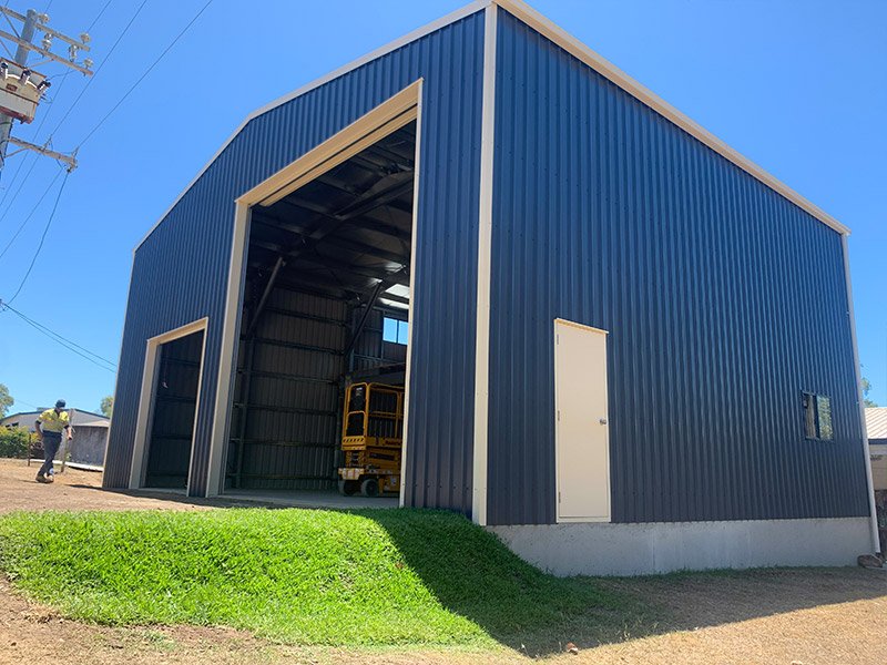She stands proud at a magnificent span of 12m by 10m length and 5.5m height and even has a mezzanine within. Decked out in Colorbond Deep Ocean® and complimenting Colorbond Classic Cream™ a stylish and classic combination.