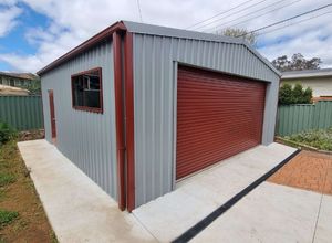 Spanning 7m x 7.2m x 3.42m to the apex, this stunning double garage is styled in COLORBOND Windspray® & Manor Red®.