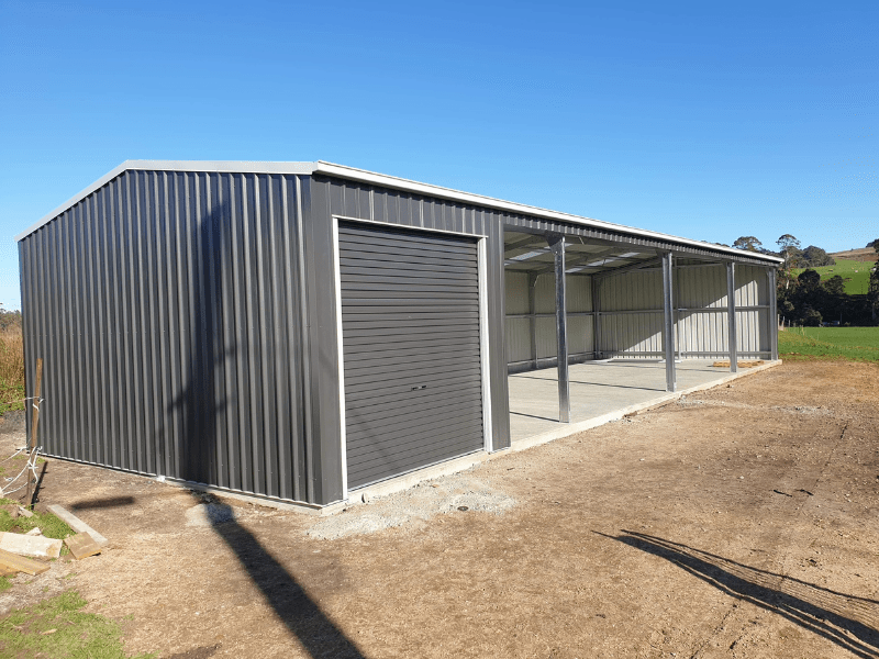 When you need shelter for your ponies and a space for a tact room, this design is a popular go to. For this customer we included 4 open bays that will be fitted out as a stable. Then we added an enclosed bay with a roller door and PA door to use as a tack room. Everything Equine in one handy place.