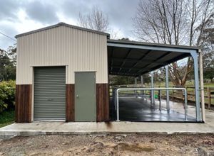 Our client also reused some of the original buildings timber to create an aesthetically pleasing exterior. Spanning 8m x 14.5m x 4.34m, styled in COLORBOND Paperbark®, Gully®, Mangrove®.