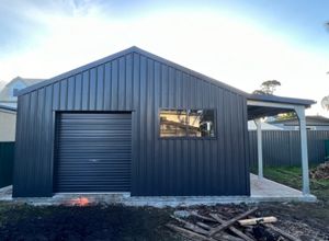 Spanning 6m x 5m x 3.94m to the apex with an additional 1.8m for the awning. Coupled with a 2.20h x 2w roller door, personal access door and 2 x windows. Styled in the well-known #COLORBOND Monument®.