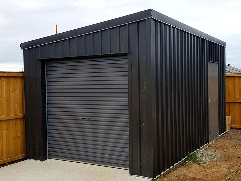 The result is this 3m wide x 5m long Skillion with a roller door and PA entrance coloured with Colorbond®'s Monument® and Basalt®.