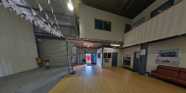This virtual tour demonstrates a commercial premises, focusing on the reception area and front roller door. A mezzanine floor, glass sliding door and enclosed office space have been integrated also.